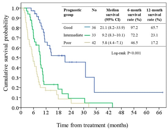 | Prognostic Group | Prognostic Score | N (%) | Median Survival, Months (95% CI) | Hazard Ratio (95% CI) | p Value |