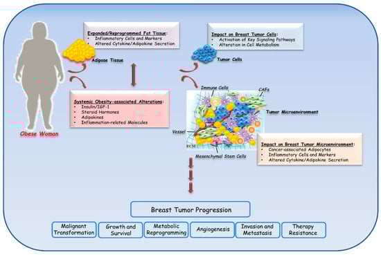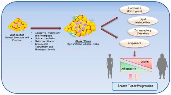 The World Health Organization (WHO) and the National Institutes of Health (NIH) refer to overweight as a body mass index (BMI, defined as weight (kg)/height (m2)) greater than 25 kg/m2, and to obesity as a BMI greater than 30 kg/m2 (30.0–34.9, grade I; 35.0–39.9, grade II; and ≥40, grade III). The increase in BMI is typically a result of an imbalance between exceeding energy consumption from dietary intake and energy expenditure from physical and metabolic activity. Unfortunately, fueled by major economic growth, social/technological changes, and a transition in nutrition over the last 30 years, the prevalence of obesity has been on the rise alarmingly [1], reaching epidemic proportions in many parts of the world. At present, according to the latest WHO fact sheets, more than 1.9 billion adults and a further 600 million people can be, respectively, classified as overweight or obese worldwide, and these rates are projected to increase at a faster pace in the coming decades [2]. This scenario has drawn particular attention from researchers due to the fact that obesity is associated with concomitant or increased risk of nearly every chronic condition, including diabetes, coronary artery disease, hypertension, kidney disease, disability, and poor mental health [3,4]. Numerous studies have also looked into the link between obesity and cancer development at various sites, especially the pancreas, oesophagus, colorectum, prostate, and breast. Indeed, there is a growing appreciation that the excessive adiposity is correlated with increased cancer incidence at a population level and may lead to poor cancer clinical outcomes [5,6,7,8]. In this regard, an intricate connection between obesity and both breast cancer incidence and the clinical behavior of the established neoplasia has been extensively described.