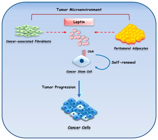 Role of leptin in mediating the interaction between stromal cells and breast cancer stem cells. Leptin, an important paracrine molecule secreted by adipocytes and cancer-associated fibroblasts within the tumor microenvironment, sustains breast cancer stem cell activity, indicating an additional mechanism by which this adipokine promotes breast malignancy.