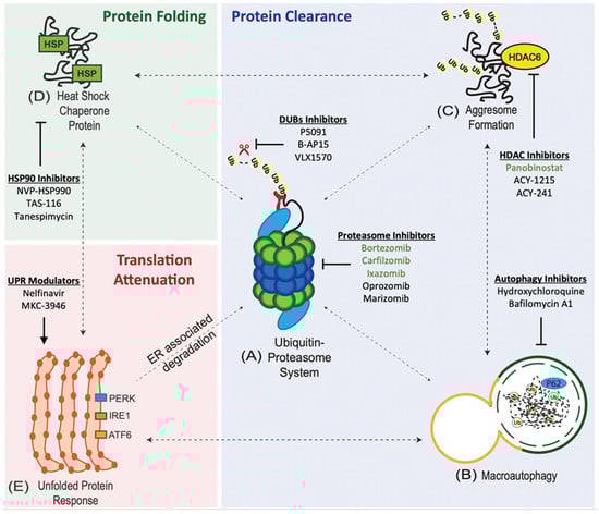 Cancer cells maintain the integrity of the proteome through an interconnected network of proteostasis pathways (Figure 1). At its core is the ubiquitin proteasome system (UPS), which works together with the macroautophagy (autophagy-lysosome) system and the aggresome pathway to regulate protein clearance [20]. The unfolded protein response (UPR) is an adaptive response to ER stress that, in addition to regulating ribosomal protein synthesis, is also able to recruit the other proteostasis pathways (such as the aggresomal or macroautophagy pathways) to either maintain proteostasis or induce apoptosis if ER stress remains unmitigated [30]. Upstream of the proteasome, the heat shock chaperone protein system, which can be induced in response to proteotoxic stress, contributes to protein homeostasis by regulating protein folding [31].