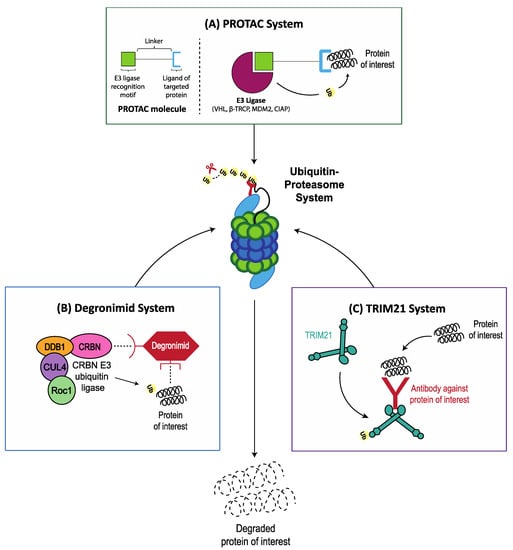 Targeted protein degradation using “degraders” has recently emerged as an attractive and promising approach against currently undruggable (and druggable) targets. Degraders are heterobifunctional small molecules, with two binding motifs separated by a linker that bind to an E3 ubiquitin ligase on one site and a specific protein of interest (POI) on the other site [146]. By redirecting the E3 ligase, degraders facilitate the polyubiquination and subsequent proteasome degradation of specific POIs. The three emerging technologies currently in preclinical development are the (1) PROTAC (PROteolysis Targeting Chimera), (2) Degronimid, and (3) TRIM21 systems [147,148].