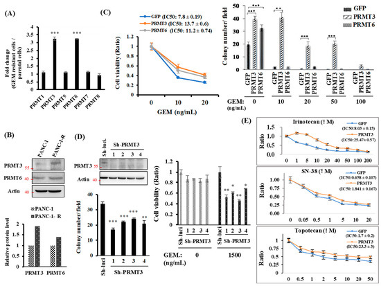 2.1. PRMT3 Is Upregulated in GEM-Resistant Pancreatic Cancer Cells and Its Overexpression Increases the Resistance to Multiple Chemotherapeutic Drugs