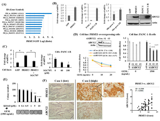We next investigated the mechanism underlying PRMT3-mediated GEM resistance. PRMT3 is a type I PRMT, which is known to induce asymmetric dimethylarginine (ADMA) methylation. Modification of histone H4R3 by PRMT3 is associated with gene transcription regulation. Moreover, PRMT3 might directly interact with the nuclear receptor liver X receptor α (LXRα) and acts as a transcription cofactor in methyltransferase-independent manner [21]. Given that PRMT3 might function as a transcriptional regulator, we studied the gene expression profiles in GFP- and PRMT3-overexpressing cells to identify potential genes that might be regulated by PRMT3 in GEM resistance. Of these top 10 genes that demonstrated increased expression (Figure 2A), the ATP binding cassette subfamily G member 2 (ABCG2), a member of the ABC transporter superfamily, which functions as a drug efflux pump, was significantly upregulated in PRMT3-overexpressing cells and has been reported to play a role in GEM resistance in pancreatic cancer [22,23,24]. Because the dysregulation of several genes, including hENT1, dCK, cytidine deaminase (CDA), and subunits of ribonucleotide reductase, has been proposed to modulate GEM resistance [25,26,27], we first assessed the expression of those genes in GEM-resistant cells. Our data showed that the expression of hENT1, CDA, dCK, and RRM2 was not altered in various GEM-resistant cell lines (Supplementary Figure S2). Further, we did not find the altered expression of those genes in our gene microarray data. Also, we did not find the increase of the members of ABCC subfamily. Only ABCG2 was significantly upregulated. Therefore, we focused on ABCG2 and validated its gene expression. As shown in Figure 2B, the expression of ABCG2 mRNA was increased in PRMT3-overexpressing cells. In addition, ABCG2 mRNA was upregulated in two GEM-resistant pancreatic cell lines, PANC-1-R and Mia-paca-2-R, when compared to the parental cells (Figure 2B). Increase of ABCG2 proteins was also confirmed in PRMT3-overexpressing cells and PANC-1-R cells (Figure 2B). Treatment of PRMT3-overexpressng cells or PANC-1-R cells with the PRMT3 inhibitor, SGC707, significantly reduced the expression of ABCG2 (Figure 2C). To corroborate the importance of ABCG2 in GEM resistance, we first silenced ABCG2 by small interfering RNAs (siRNAs) in PRMT3-overexpressing cells and PANC-1-R cells and assayed for cell viability under GEM treatment. Loss of ABCG2 resulted in the increased sensitivity of cells to GEM (Figure 2D). Moreover, we treated PANC-1-R cells with the ABCG2 inhibitor KO143, which significantly enhanced the sensitivity of PANC-1-R cells to GEM (Figure 2E). The results suggested that the expression of ABCG2 is critical for mediating GEM resistance. The expression of PRMT3 and ABCG2 and their association were investigated in PDAC tumor tissues (N = 81) by immunohistochemical staining. Representative images of tumors with weak and strong staining of these two proteins are shown in Figure 2F. The results demonstrated a positive association between the expression of PRMT3 and ABCG2 in the tumors (p < 0.0001; Figure 2F, right). Together, these data suggested that upregulation of ABCG2 expression by PRMT3 contributes to GEM resistance in pancreatic cancer.