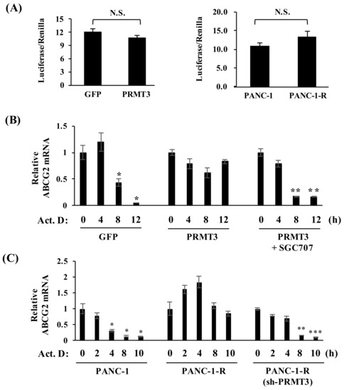 2.3. PRMT3 Upregulates the Expression of ABCG2 via Increased mRNA Stability