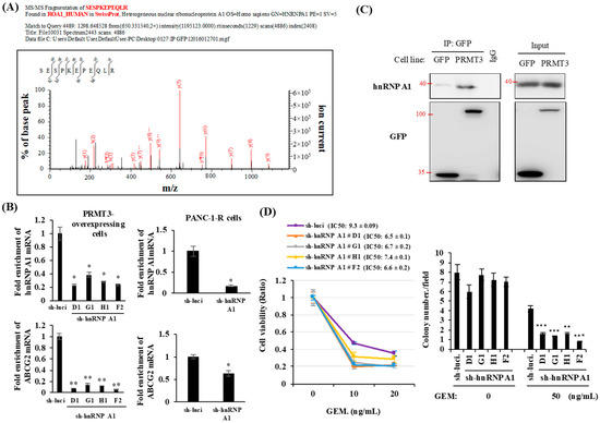 To elucidate how PRMT3 increases the stability of ABCG2 mRNA, we first searched the interacting proteins of PRMT3 to identify potential mediators involved in the regulation of mRNA stability. For this purpose, PRMT3-associated proteins were pulled down and identified by mass spectrometric analysis. A total of 293 potential PRMT3-associated proteins, including a well-known PRMT3 interaction partner, rpS2, were identified. We noticed that a number of heterogeneous nuclear ribonucleoproteins (hnRNPs), including hnRNP D and hnRNP A1, were potential PRMT3 interacting proteins (Supplementary Table S1). The hnRNP family modulates mRNA metabolism, splicing, and transcriptional and translational regulations [28,29]. To determine whether hnRNPs affect the expression of ABCG2 mRNA, we depleted hnRNP D and hnRNP A1 by short hairpin RNAs (shRNAs). However, depletion of hnRNP D had no effects on ABCG2 mRNA level (Supplementary Figure S3). We next studied hnRNP A1, another interacting partner of PRMT3 identified in our LC/MS/MS study (Figure 4A). Depletion of hnRNP A1 significantly reduced the expression of ABCG2 mRNA in both PRMT3-overexpressing cells (Figure 4B, left panel) and PANC-1-R cells (Figure 4B, right panel). Thus, we focused on hnRNPA1 in all subsequent experiments. The interaction between PRMT3 and hnRNP A1 was further validated by co-immunoprecipitation assay (Figure 4C). To assess whether hnRNP A1 is involved in GEM resistance, hnRNP A1 was depleted by shRNAs in PRMT3-overexpressing cells. These cells were subjected to cell viability assay (Figure 4D, left) and anchorage-independent growth (Figure 4D, right) in the presence or absence of GEM. The results demonstrated that reduction of hnRNP A1 increased the sensitivity to GEM in these cells. Together, these data suggest that hnRNP A1 is a PRMT3-associated protein and is involved in the regulation of ABCG2 expression and GEM resistance.
