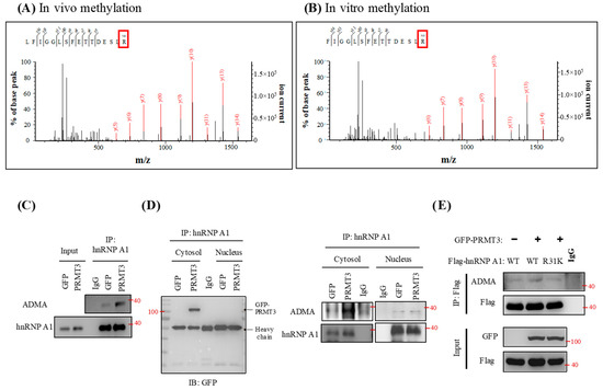 Active recombinant full-length human PRMT3 protein (Cat No. ab167953, Abcam) was purchased from Abcam. Human hnRNP A1 recombinant protein (Cat No. pro-1038) was purchased from PROSPEC. PRMT3 (1 μg) was incubated with hnRNP A1 (2 μg) in the presence of 40 μM S-adenosyl-L-methionine (Sigma) for 1 h at 30 °C in a final volume of 25 μL of phosphate-buffered saline. After incubation, sample was separated by SDS-PAGE, and the protein band corresponding to hnRNP A1 was excised for mass spectrometry.