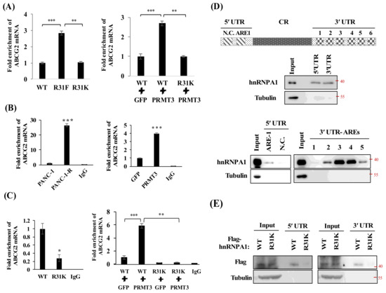 To assess whether PRMT3-methylated R31 of hnRNP A1 affects the stability of ABCG2 mRNA, we generated PANC-1 cells expressing hnRNP A1-WT, hnRNP A1-R31K, and hnRNP A1-R31F (methylation-mimicking mutant) and analyzed the ABCG2 mRNA levels. As shown in Figure 6A, the hnRNP A1- R31F mutant demonstrated increased levels of ABCG2 mRNA compared to hnRNP A1-WT- and hnRNP A1-R31K-expressing cells. Moreover, co-expression of PRMT3 and hnRNP A1-WT upregulated ABCG2 mRNA level while co-expression of PRMT3 and hnRNP A1-R31K did not show any increase. These results suggested that PRMT3 upregulated the expression of ABCG2 mRNA through R31 methylation of hnRNP A1.