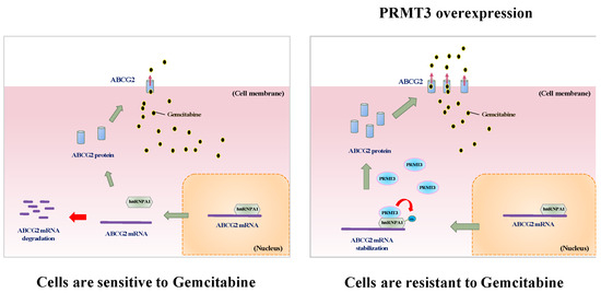 Proposed model of PRMT3-mediated GEM resistance in pancreatic cancer cells. PRMT3 is upregulated in GEM-resistant pancreatic cells and its overexpression stabilizes ABCG2 mRNA via methylating arginine 31 of hnRNPA1. PRMT3-mediated ABCG2 upregulation contributes to gemcitabine resistance.