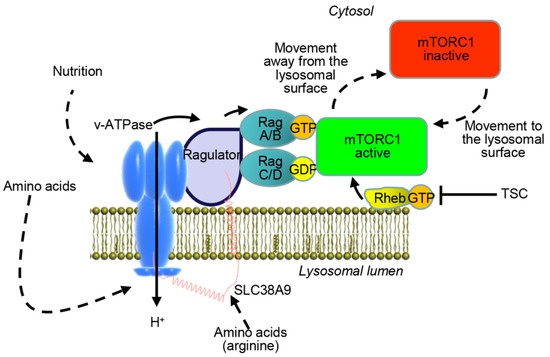 Upon stimulation by growth factors such as insulin, the serine/threonine kinase AKT is activated and phosphorylates TSC [37,41]. This phosphorylation results in the dissociation of TSC from the lysosomes, where TSC resides in growth factor-deprived conditions, and thus blocks its inhibitory effects toward Rheb [45,46]. mTORC1 is recruited to the lysosomal membrane from the cytosol under normal (non-stressed), nutrition-replete conditions. The recruitment to and retention of mTORC1 in the lysosomes is regulated through an amino acid-sensing cascade involving v-ATPase (vacuolar-type H+-ATPase), Ragulator, and Rag (Ras-related GTPases) GTPases [17,18,38,39,40]. v-ATPase supports Ragulator activation which leads to the formation of active heterodimeric complexes RagA/B–RagC/D in the lysosomes [17,18,38,39,40,47]. The Rag GTPase complex becomes active by acquiring an activated guanyl-loaded configuration in which RagA/B is GTP-loaded and RagC/D is GDP-loaded [38,40]. Such configuration facilitates the lysosomal attachment of mTORC1 by direct interaction with Raptor [38,40]. Active Rag GTPases translocate mTORC1 to the lysosomes where the kinase is activated by Rheb [17,18,38,39,40,47]. The activation of Rag GTPases is mediated by the presence of amino acids [17]. Recent studies advocate SLC38A9 (a putative sodium-coupled amino acid transporter in the lysosome membrane) to be a sensor that signals arginine sufficiency to mTORC1 [48,49,50].