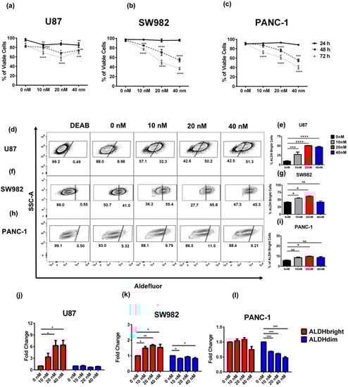 Dosing effect of bortezomib on ALDHbright cells. The anti-viability effects of bortezomib treatment were assessed in glioblastoma (U87) (a), synovial sarcoma (SW982) (b), and pancreatic adenocarcinoma (PANC-1) (c) cells. U87 (d,e), SW982 (f,g), and PANC-1 (h,i) cells were analyzed by flow cytometry after 48 h of bortezomib for the frequency of live cells with an ALDHbright phenotype. The fold change of viable ALDHbright and ALDHdim cells was compared using flow cytometry for U87 (j), SW982 (k), and PANC-1 (l) cell lines. DEAB: Representative gating for the N,N-diethylaminobenzaldehyde control selective inhibitor of aldehyde dehydrogenase isoenzymes. Experiments were repeated three-five times, including a minimum of three technical replicates for each experiment. (* = p < 0.05, ** = p < 0.01, *** = p < 0.001, **** = p < 0.0001).