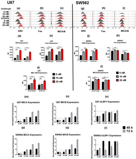 Bortezomib has been shown to induce the expression of death receptors such as DR5 on the surface of both mouse and human tumor cell lines []. Therefore, we next evaluated if bortezomib would induce differential expression of death receptors and stress ligands on ALDH subpopulations in our cancer cell lines. Bortezomib significantly upregulated the expression of DR5, Fas, and MICA/B on both ALDHbright and ALDHdim U87 cells in vitro (Figure 2a–f). Similarly, we observed a significant increase in DR5, MICA/B, and Fas expression in SW982 cells following bortezomib treatment (Figure 2g–l). For each protein examined, bortezomib induced a dose-dependent increase in protein expression with 20 nM of bortezomib showing the highest level of upregulation as quantified by median fluorescence intensity (MFI) level by flow cytometry. Additionally, we compared the mRNA expression of MICA, MICB, and ULBP1 in U87 and SW982 cells after 48 and 72 h of bortezomib exposure (Figure 2m–o). U87 cells increased expression of the both MICA and MICB at 48 h and 72 h post-treatment. However, we observed ULBP1 to be more than two-fold upregulated only at a dose of 40 nM at 72 h post-treatment (Figure 2o). In SW982 cells, we observed a similar upregulation of MICA and MICB gene expression at both 48 and 72 h time points post-treatment (Figure 2p,q). Interestingly, the expression of ULBP1 increased by at least two-fold in SW982 cells at 48 h at doses of 10 and 20 nM, however, gene expression levels decreased at 72 h. In the 40 nM treatment group, the expression was a consistent significant increase in ULBP1 expression >2-fold baseline at both 48 and 72 h. Given reports that bortezomib treatment decreases MHC class I expression in ALDHbright cells in multiple myeloma and thereby sensitizes myeloma to NK killing [], we then investigated the expression of MHC class I in our glioblastoma and sarcoma cancer lines after bortezomib exposure. Although we observed increased expression of MHC class I in U87 cells treated at 10 and 20 nM doses for 48 h with exception between 0 and 10 nM in the ALDHdim subpopulation (Figure S2a), no significant differences were observed in SW982 (Figure S2b). It has been reported previously that the absence or downregulation of MHC class I molecules by tumor cells could be associated with escape mechanisms from T cell targeting []. In this regard, upregulation of MHC class I expression on U87 cells and maintenance on SW982 cells may represent an inducible pathway that cancer cells utilize to resist immune pressure from NK or T cells depending on the dominant cellular/local conditions. Regardless, our data demonstrate that upregulation of NK ligands is a prevalent phenomenon among tumor cells after bortezomib exposure. Although this upregulation occurred in both ALDHbright and ALDHdim subsets, the increase in ALDHbright cell numbers and frequencies after bortezomib exposure suggests that expression of these stress ligands is relevant to NK targeting of these resistant cells after cytotoxic/cytostatic drug therapies.