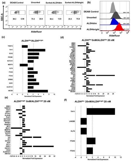 Next, we sought to investigate gene signature differences between the ALDHbright and ALDHdim sorted tumor subpopulations. Therefore, we sorted, then expanded and phenotyped ALDHbright and ALDHdim cells from U87 parent cells. We observed that after short term culture over 1–2 weeks, we were able to maintain relatively pure ALDHbright and ALDHdim populations (Figure 3a,b). The frequency of the ALDHdim subpopulation in the sorted and expanded ALDHdim subpopulation remained at approximately 14% with an MFI of 2537 ± 125, while in the ALDHbright population the frequency of ALDHbright cells remained at approximately 74% with an MFI of 8570 ± 545. In the unsorted parent cells, the population frequency of the ALDHbright population was approximately 24% with an MFI of 3195 ± 18 (Figure 3a,b and Figure S3a). Using these sorted and short-term expanded ALDH subpopulations, we then isolated RNA and performed a PCR array, analyzing 88 unique target genes associated with cancer stem cell signatures. After analysis, we observed that the ALDHbright subpopulation demonstrated increased expression of ABCB5, ALDH1A1, DDR1, ERBB2, ITGA2, ITGA6, KLF4, NOTCH1, PROM1, SOX2, and THY1 genes. In contrast, expression of MERTK1, and TWIST2 was found to be downregulated (Figure 3c). Interestingly, the majority of the genes that we found to be upregulated in the ALDHbright subpopulation have been reported as markers involved not only in CSCs in general, but particularly in brain tumor CSCs [,,].