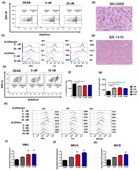 Effects of bortezomib on primary human brain and breast cancer cells. Freshly excised primary glioblastoma multiforme (BN-0469) and primary breast cancer (BR-1416) surgical specimens were treated ex vivo with increasing doses of bortezomib. (a) After overnight incubation with 20 nM bortezomib, BN-0469 showed significant upregulation of ALDHbright cells when compared to both DEAB and vehicle controls. (b) Representative hematoxylin and eosin staining (H&E) section of BN-0469 shows characteristic features of glioblastoma multiforme, 20× magnification. (c) Representative histogram for BN-0469 treated with 0 nM (black histogram representative for ALDHbright and gray histogram representative of ALDHdim subpopulations, respectively) or 20 nM (dark blue histogram representative of ALDHbright and light blue for ALDHdim subpopulations, respectively). MFI values are adjacent to the corresponding histograms. (d) Representative histopathology of high grade, mitotically active breast carcinoma, 10× magnification. (e) After 24 h treatment with either 5, 10, or 20 nM bortezomib treatment, there was a significant increase in frequency of ALDHbright cells on all bortezomib treated cells ex vivo. (f,g) Bar graph shows the number of ALDHbright and ALDHdim cells in BR-1416 cells after bortezomib for 24 h. (h) Representative histogram shows the expression by MFI of DR5, Fas and MICA/B in ALDHbright and ALDHdim on BN-0469. (i–k) qPCR of BR-1416 cells treated with bortezomib after 24 h shows a significant dose dependent increase in expression of Smoothened Frizzled Class Receptor (SMO), MICA, and MICB. (* = p < 0.05, ** = p < 0.01, *** = p < 0.001).