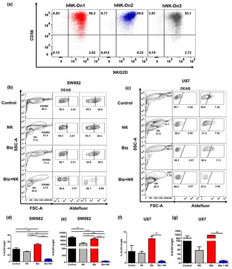 Bortezomib promotes NK cell killing of ALDHbright cells in vitro. (a) Representative flow cytometry shows CD56 and NKG2D expression on expanded and activated human NK cells from three different donors (hNK-Dn1- hNK-Dn3) after 14 days in co-culture with irradiated K562 feeder cell line and 100 IU/mL rhIL-2. (b) SW982 and (c) U87 cells were pretreated with or without 20 nM bortezomib for 24 h prior to co-culture with activated human NK cells at an Effector: Target (E:T) ratio of 0.125:1 for 12 h. Representative flow cytometry showed increased NK killing of ALDHbright cancer cells after 20 nM bortezomib. The frequency and number of ALDHbright SW982 (d,e) and U87 (f,g) cells in different co-culture conditions were assessed. (* = p < 0.05, ** = p < 0.01, *** = p < 0.001, **** = p < 0.0001).