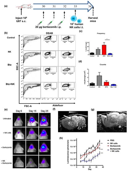 Based on these data, we then sought to assess the efficacy of bortezomib plus NK adoptive transfer in vivo. First, we tested if the augmented ALDHbright tumor cell killing we observed in vitro could be replicated in vivo, where the three-dimensional (3D) nature of the tumor and issues of drug and NK cell accessibility to the tumor could alter the effectiveness of either treatment alone or the combination. To do so, we implanted subcutaneous U87 tumors into the flanks of immunodeficient NSG mice (Figure 6a). When tumors reached 5–7 mm in diameter, mice were injected with 20 μg of intraperitoneal (i.p.) bortezomib ×3 and/or activated NK cells, and tumors were assessed for changes in ALDHbright cells following in vivo treatment (Figure 6b). Similar to the results observed in vitro, bortezomib alone led to a significant increase in the frequency of ALDHbright cells (Figure 6c), with little effect on the total number of ALDHbright cells (Figure 6d) within the tumor. In contrast, the combination of bortezomib and NK cells administered intra-tumorally 24 h after bortezomib treatment led to a significant decrease in both the frequency and total number of ALDHbright cells recovered (Figure 6c,d).