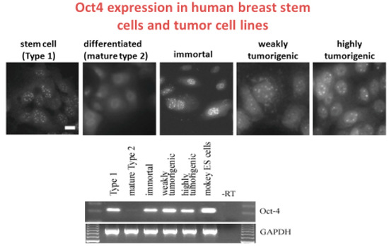 The composite of these two figures illustrates that the clonally- derived normal human adult breast stem cells express Oct4A (Type 1), via immune-histochemical use of fluorescent antibodies to Oct4A in the normal breast stem cells, but not in the differentiated breast cells (Type 2), are still expressed in SV40 immortalized normal breast stem cells, which are not tumorigenic, are still expressed in irradiated and weakly tumorigenic breast stem cells and are expressed in the neu/ErB-2 highly transformed clone. The Type 2 cells were differentiated normal human breast stem cells. The reverse transcription polymerase chain reaction data are correlated with the immuno-histochemical data of Oct4A in this series of human breast adult stem cells. No expression of Oct4 was seen in Type II differentiated cells (lane 2) but Oct4A was still expressed in the immortalized, weakly and highly tumorigenic cells. Monkey ES cells were used as a positive control (lane 6). Lane 7 is a no template control. While the GJIC data were not shown here, the normal breast adult stem cells (Type 1), immortalized, weakly and highly tumorigenic cells have no functional GJIC, as measured by the fluorescent scrape loading/dye transfer technique, whereas the Type 2 cells had functional GJIC. Type 2 or differentiated Type 1 cells were derived from Type 1 or adult human breast stem cells after the Type 1 cells had been exposed to cholera toxin [114]. Scale bars: For Type 1 to highly tumorigenic cells was 20 μm. Permission granted by MDPI Publisher, Basel, Switzerland.