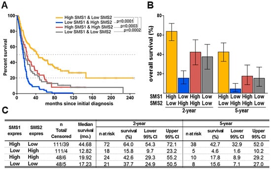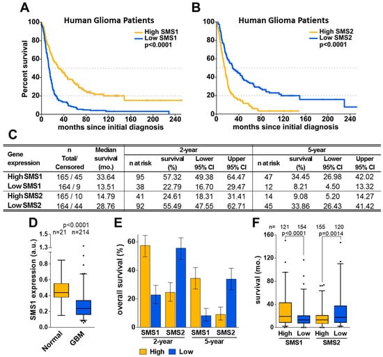 When analyzing SMS1 and SMS2 gene expression, glioma patients were classified into 2 groups defined by high or low SMS1 or SMS2 expression with respect to the median expression for each gene. Patients with high SMS1 expression (SMS1-high) had longer median survival than patients with low SMS1 expression (SMS1-low; Figure 1A,C). Compared to normal tissue from healthy subjects, SMS1 had a significantly lower expression in GBM patients (Figure 1D), thus indicating its implication in tumorigenesis and its value as a prognostic factor. Conversely, patients with low SMS2 expression had longer median survival than patients with high SMS2 expression (Figure 1B,C). Consistent with the median survival, the two-year and five-year survival rates were higher for SMS1-high or SMS2-low groups, whereas patients in SMS1-low or SMS2-high groups had a worse prognosis (Figure 1 C,E,F).