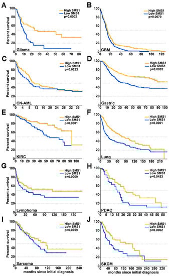SMS1 expression and overall survival in patients with different types of cancer. Kaplan-Meier plots representing overall survival as a function of SMS1 expression measured in biopsies from patients with (A) glioma (grade III and IV, from the GSE4412 database; n = 83), (B) glioblastoma multiforme (GBM; n = 542), (C) cytogenetically normal acute myeloid leukemia (CN-AML; n = 163), (D) gastric cancer (n = 299), (E) kidney renal clear cell carcinoma (KIRC; n = 234), (F) lung cancer (n = 282), including NSCLC (non-small cell lung cancer) and SCLC (small cell lung cancer), (G) lymphoma (B-cell lymphoma and Burkitt’s Lymphoma; n = 158), (H) pancreatic ductal adenocarcinoma (PDAC; n = 102), (I) sarcoma (n = 234), or (J) skin cutaneous melanoma (SKCM; n = 163). For each data set, patients’ cancer samples were classified as high- and low-expressing tissue if the SMS1 expression was higher or lower than the median expression. The p values from the log-rank tests comparing the two curves are shown in each figure. n: number of patients in each data set.