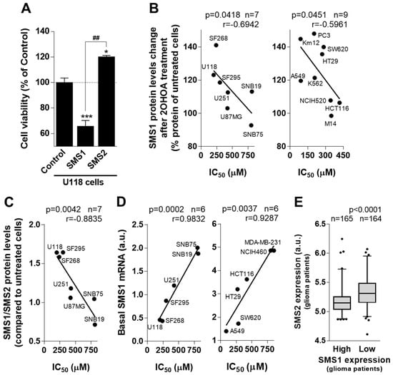 In addition, SMS1 and SMS2 protein levels were evaluated in several cancer cell types after exposure to 2OHOA. SMS1 and SMS2 were measured after 48 h in the presence or absence (control, 100%) of 2OHOA (200 µM) in 16 cancer cell lines (Figure 4 and Figure S6), and the IC50 for 2OHOA was also determined in these cell lines (Table S1). An inverse correlation was observed between the change in SMS1 protein levels after 2OHOA treatment and their IC50 values in 7 human GBM cell lines (Figure 4B left panel). Similar results were obtained when this correlation was assessed in another 9 non-glioma cancer cell lines (Figure 4B right panel). 2OHOA-mediated increase in SMS1 expression correlated with lower IC50 values (i.e., stronger antitumor effect). In addition, cell lines with higher increase in SMS1 expression after 2OHOA treatment displayed the lowest basal SMS1 mRNA expression levels (Figure 4D). Moreover, SMS1/SMS2 ratio inversely correlated with IC50 values for 2OHOA (Figure 4C and Table S2). These results indicated that glioma cell lines responded better to drug treatment upon SMS1 increase, SMS2 decrease or both. Accordingly, the ratio of these two proteins represents a relevant predictor of drug potency and efficacy. Indeed, an inverse correlation between SMS1 and SMS2 expression was observed when their mRNA levels were analyzed in 386 glioma patients (p < 0.0001; Figure 4E), thus further supporting the clinical relevance of the SMS1/SMS2 ratio in glioma progression and prognosis.