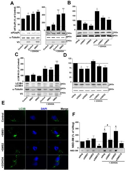 2OHOA activates ER stress and macroautophagy in glioma cells [,]. An immediate response under ER stress is a general protein synthesis inhibition mechanism due to increased phosphorylation of the α subunit of the translation initiation factor eIF2α at Ser51 []. In turn, this effect mediates conversion of light chain 3 (LC3) from the soluble LC3-I to the membrane-bound LC3-II form, a key step in autophagy induction in mammalian cells []. These two ER stress markers (LC3 and eIF2α) were assessed and the levels of phosphorylated eIF2α increased after exposure to 2OHOA []. Overexpression of either SMS1 (Figure 6A, left) or SMS2 (Figure 6A, right) mimicked the increase in phospho-eIF2α induced by 2OHOA, whereas downregulation of either SMS1 or SMS2 decreased phosphorylation of eIF2α by 35% and 55%, respectively (Figure 6B). Furthermore, phosphorylation of eIF2α induced by 2OHOA was maintained following SMS1 or SMS2 overexpression (Figure 6A), although it was abolished when either SMS1 or SMS2 were silenced (Figure 6B). SMS1, but not SMS2, overexpression and 2OHOA provoked increase in the LC3B II-to-LC3B I ratio, (Figure 6C). Confocal microscopy revealed the cytoplasmic aggregation of LC3 upon SMS1 overexpression (Figure 6E). In contrast, LC3B II-to-LC3B I ratio decreased by 30% in response to SMS1 downregulation (Figure 6D). Furthermore, the 2-fold increase in LC3B II-to-LC3B I ratio induced by 2OHOA was maintained when SMS1 and SMS2 were overexpressed, and it was abolished when SMSs were silenced upon siRNA treatment.