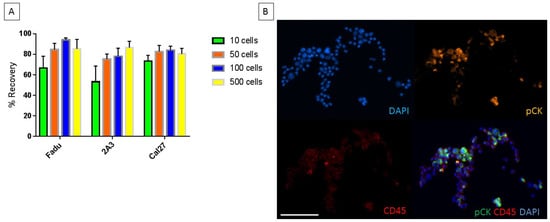 Three HNC cell lines, which have a mean diameter above 15 µm, were used for spike-in and recovery experiments. The numbers of cells used for spike-in experiments were relatively low to reflect clinically relevant CTC counts which are typically found in HNC (10–500 cells total). The percentage recovery for cell counts between 50–500 cells ranged from 70–96%. For spike-in experiments of 10 cells, the percentage recovery ranged from 40–80% (Figure 2A). The straight chip allows for a higher percentage recovery without a need for multiple rounds of re-processing which can be required with other technologies [12,30,31]. The staining specificity of the CellSearch antibody cocktail is shown in (Figure 2B) where cancer cells FaDu (ATCC®HTB43TM, Manassas, VA, USA) are detectable in a background of WBCs.
