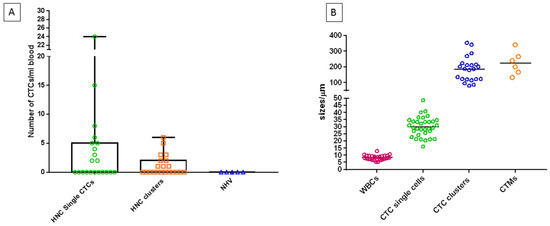 (A) The number of CTCs/CTC clusters detected per ml mL blood from HNC patients and normal healthy volunteers (NHV) processed through the straight microfluidic chip. The distribution of single and clustered CTCs/mL is shown and the presence of no CTC-like events in the NHV. (B) The size distribution of white blood cells (WBCs), single CTCs and CTC-clusters.