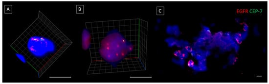 (A,B) 3D EGFR DNA FISH of single CTCs showing the number of EGFR signals (red) to CEP-7 (green). (C) EGFR DNA FISH of a CTC cluster showing a number of EGFR amplified cells. The ratio of EGFR:CEP-7 shows EGFR amplification in the CTCs. Scale bar represented 10 µm.