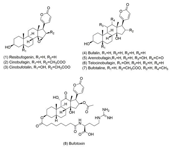Despite considerable efforts on early diagnosis and treatment in the last decade, breast cancer remains the most common malignancies for women worldwide, representing ~22% of female malignancies [1,2,3,4]. In addition to early diagnosis, new chemotherapeutic agents and more effective therapies are needed to reduce mortality. Traditional Chinese medicine has existed for thousands of years and can treat cancer. Chansu is one of the most famous traditional Chinese medicines. It has been used for centuries in various aspects, such as anaesthesia for anesthesia, antitumor, anti-inflammation, and anti-arrhythmia conditions [5,6,7,8]. Chansu is mostly from the glandular secretion and dried product of Bufo bufo gargarizans Cantor or Bufo melanostictus Schneider [8]. It includes resibufogenin, bufalin, arenobufagin, cinobufagin, bufotoxin, telocinobufagin, bufotaline, and cinobufotalin [5,6,8] (Figure 1).
