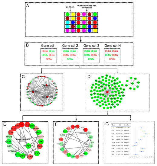 The workflow to study the potential mechanism of bufadienolides-like chemicals on breast cancer via bioinformatics analysis. (A) The experimental design and basic information of this analysis. (B) The DEGs’(Differentially expressed genes) identification with the GSVA (Gene set variation analysis) algorithm [15]. (C) Similar small-molecule detection with the Comparative Toxicogenomics Database (CTD) [16] and connectivity map (CMAP2) [17,18] database. (D) The tissue-specific co-expression network constructed with the TCSBN (Tissue and cancer specific biological networks) database [19]. (E) The differentially expressed subnetworks detected with the UberPheno database and PhenomeScape plug [20]. (F) The arrhythmia-related subnetworks detected with the UberPheno database and PhenomeScape plug [20]. (G) The expression and survival relation of hub genes validated by TCGA (The Cancer Genome Atlas) [21] and the Kaplan-Meier (KM) plotter databases [22].