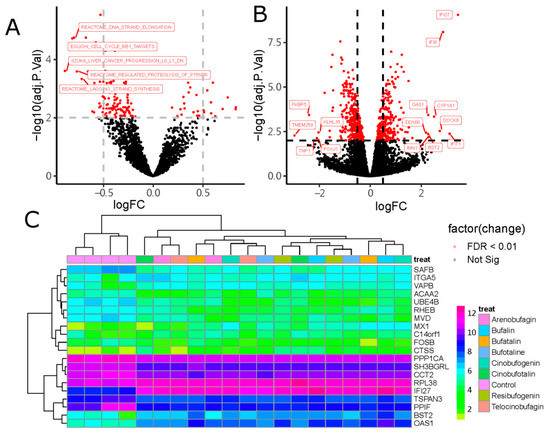The differentially expressed genes (DEGs) disturbed by bufadienolide-like chemicals through the gene set variation analysis (GSVA) algorithm. (A) The differentially expressed gene sets disturbed by bufadienolide-like chemicals (|logFC| ≥ log2(2) and adjPvalue < 0.001). (B) The DEGs relate to differentially expressed gene sets (|logFC| ≥ log2(2) and adjPvalue < 0.001). (C) The heatmap of the top 20 DEGs disturbed by bufadienolide-like chemicals.