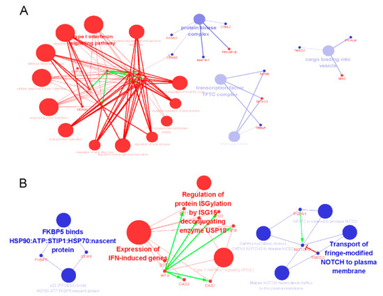 In order to obtain a biological interpretation of those genes in the GO and KEGG pathway functional groups, GO and KEGG enrichment analysis were performed with the clueGO plug [23] in Cystoscape [24]. Results indicated that those genes that were up-regulated were rich in terms of type I interferon signaling response to virus, defense to other organisms, regulation of viral genome replication, and 2′-5′-oligoadenylate synthetase activity, and those activated may be because of the up-regulation of IRF9, IFI6, IFI27, ISG15, IFIT1, OAS1, and OAS3 (Figure 4A). Further investigation with the KEGG pathway enrichment analysis showed those up-regulated genes could cause the activation of the IFN-induced pathway, type II interferon signaling pathway, and regulation of protein ISGylation by the ISG15 deconjugating enzyme USP18 pathway (Figure 4B). The genes that were down-regulated were rich in terms of protein kinase complex, transcription factor TFTC complex-1, the SAGA-complex, and cargo loading into vesicle (Figure 4A). Further investigation with KEGG pathway enrichment analysis showed those genes could negatively affect the transport of fringe-modified NOTCH to the plasma membrane pathway (Figure 4B).