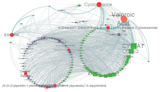 Chemicals-gene interaction network for the DEGs disturbed by bufadienolide-like chemicals. Square nodes represent the DEGs. Circle nodes represent the chemicals predicted by the CTD Database. The size of the nodes represents the degree. Circle nodes with red represent the similar small molecule predicted by degree (degree ≥ 30).