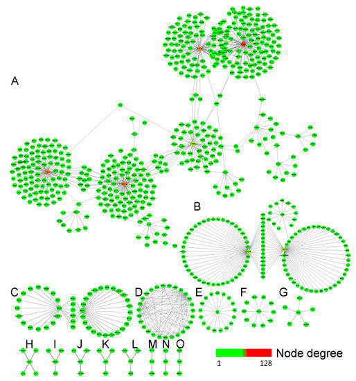 The breast tissue specific co-expression network with DEGs generated by the TCSBN (Tissue and cancer specific biological networks) database (http://inetmodels.com/) through the NetworkAnalyst (https://www.networkanalyst.ca/) web server. (A–O), the subnetworks of co-expression network origin from the seeds of DEGs.