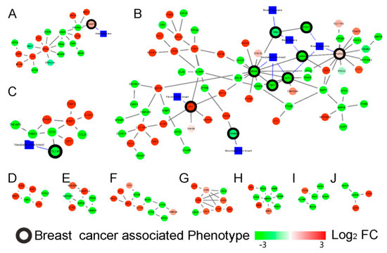 The differentially expressed networks regulated by bufadienolide-like chemicals, and generated by the PhenomeScape plug. Sub-networks linked to breast cancer, RNA splicing (2.00 × 10−3) (A), apoptotic process (2.00 × 10−3) (B), extracellular matrix organization (1.00 × 10−3) (C), canonical Wnt signaling pathway (2.20 × 10−2) (D), synaptic transmission (1.40 × 10−2) (E), negative regulation of JAK-STAT (Janus kinase/signal transducers and activators of transcription) cascade (4.20 × 10−2) (F), adherens junction organization (3.80 × 10−2) (G), BMP signaling pathway (4.10 × 10−2) (H), negative regulation of cell migration (1.30 × 10−2) (I), and activation of signaling protein activity involved in the unfolded protein response (1.90 × 10−2) (J). The fold change of the proteins is shown by the node color, and breast cancer-associated phenotype annotated proteins were used to generate the sub-networks and are shown with a black border.