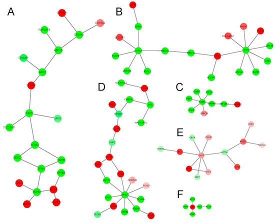 The differentially regulated sub-networks with potential cardiotoxicity disturbed by bufadienolide-like chemicals, generated by the PhenomeScape plug with seeds of 11 cardiotoxicity phenotypes. (A) Subnetwork related to membrane depolarization during action potential (3.70 × 10−2), (B) Subnetwork related to retinoic acid receptor binding (2.00 × 10−3), (C) Subnetwork related to GABA receptor binding (3.00 × 10−3), (D) Subnetwork related to positive regulation of nuclear division (5.00 × 10−3), (E) subnetwork related to negative regulation of viral genome replication (3.00 × 10−3), and (F) subnetwork related to negative regulation of viral life cycle (1.00 × 10−3).