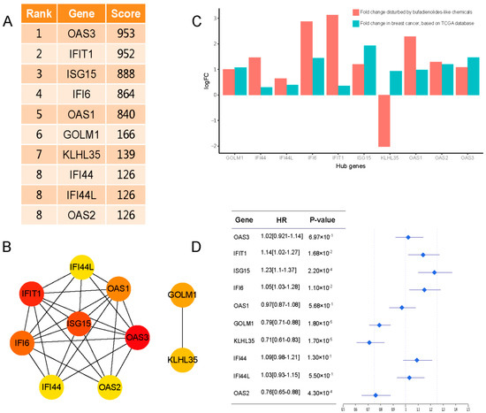 Hub genes, mostly the highly connected nodes in the network, were identified by node degree and the MCC (Maximal clique centrality) algorithm with the Cytoscape plugin, cytoHubba [33]. Based on the threshold of the degree (degree > 5) and the MCC algorithm, 10 genes with MCC scores ranging from 126 to 953 were identified as hub genes (Figure 9A,B). Ten hub genes, including three 2′-5′-oligoadenylate synthetase genes, OAS1, OAS2, and OAS3; five interferon-induced genes, ISG15, IFIT1, IFI6, IFI44, and IFIL44L; and two other genes, including the kelch-like family member 35 (KLHL35) and Golgi Membrane Protein 1 (GOLM1) were identified. These were selected as the hub genes. Further investigation with TCGA [21] and the Kaplan-Meier databases [22] indicated that the 10 hub genes except KLHL35 were increased both in the treatment with bufadienolide-like chemicals and the TCGA breast cancer sample (Figure 9C). Six hub genes, including IFIT1, ISG15, IFI6, GOLM5, KLHL35, and OAS2, were associated with the total survival probability in breast cancer patients (Figure 9D). Further analysis of the correlation between the hub genes and the total survival time in breast cancer indicated that the high expression of GOLM5, KLHL35, and OAS2 was associated with a better survival probability.