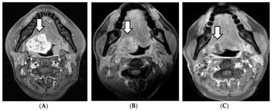 MRI of a patient, cT3N1MO case. The initial treatment effect was PR; thereafter, the tumor continued to shrink. (A) Before treatment. (B) After 3 months. (C) After 48 months. White arrow: initial or remaining tumor.
