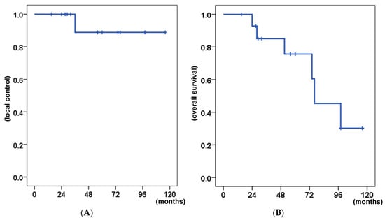 Kaplan–Meier curves of the clinical results for all patients. (A) Local control. (B) Overall survival.