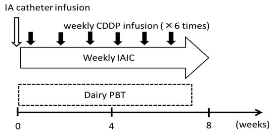 The eligible patients were as follows: histologically confirmed ACC of the base of the tongue; stage IV; no history of radiotherapy for a head and neck cancer; and follow-up duration of more than 12 months. The patients were required to have an Eastern operative Oncology Group performance status (EOCG-PS) of 0 or 1, a white blood cell count, >3500/μL; neutrophil count, >2000/μL; a platelet count, > 1 × 105/μL; hemoglobin, >9 g/dL; and no severe dysfunction of the liver, kidney and heart. Tumor restaging was based on the Union for International Cancer Control TNM Classification of Malignant Tumors, eighth edition [30] by disease evaluation that included computed tomography (CT), magnetic resonance imaging (MRI), and fluoro-2-deoxy-D-glucose positron-emission tomography-CT (PET-CT). Written informed consent was obtained from all subjects prior to the initiation of treatment. The treatment schedules are summarized in Figure 4. All patients received daily PBT and weekly IAIC.
