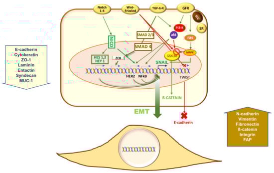 Among growth factors (GF), transforming growth factor β (TGF-β) deserves particular interest, since it plays a major role in physiological EMT. TGF-β might promote EMT through the SMAD (small mothers against decapentaplegic homologs)- independent or -dependent signaling. Accordingly, TGF-β binds to its type II and type III receptors (TGF-βRII and TGF-βRIII), thereby leading to recruitment and phosphorylation of the type I receptor (TGF-βRI). Activation of PI3-K and Ras then follows, and expression of EMT-inducing proteins increases (SMAD-independent signaling). The SMAD-dependent signaling, instead, proposes that phosphorylation of TGF-βRI by the Ser/Thr kinase activity of TGF-βRII creates a docking site in the Gly/Ser–rich domain of TGF-βRI, which recruits the transcription factors SMAD2 and SMAD3. SMADs are consequently phosphorylated at Ser residues in their C-terminal domain, facilitating the formation of a complex with the co-activator SMAD4. This signal allows their subsequent translocation into the nucleus and activation of zinc finger E-box-binding homeobox (ZEB), which finally leads to expression of mesenchymal markers [9,10,11,12,13,14,35].