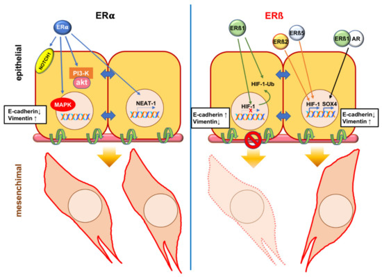 Estrogen receptor (ER) α or β control the epithelial mesenchymal transition (EMT) program in prostate cancer (PC). Left panel: the ligand activated ERα might induce EMT through transcriptional up-regulation of Neurogenic locus notch homolog protein 1 (NOTCH1) [71] or nuclear enriched abundant transcript 1 (NEAT-1) [70]. Phosphoinositide 3-kinase (PI3-K)/AKT and Ras/Mitogen activated protein kinase (MAPK) pathways both induce EMT of PC [25,26]. As the ligand-bound ERα triggers activation of both these pathways in target cells [27,28,29], it might be argued that such activation leads to EMT in PC. Right panel: the ligand activated ERβ1 hinders EMT by repressing the transcription of hypoxia-induced factor 1α (HIF-1α) and promoting its degradation by proteasome [93]. By stabilizing HIF-1α, ERβ2 and 5 promote EMT [46]. Under certain conditions, ERβ1 could dimerize with androgen receptor (AR) upon being challenged with estrogens. Sex determining region Y box 4 (SOX4) up-regulation follows and this event leads to EMT in PC [102].