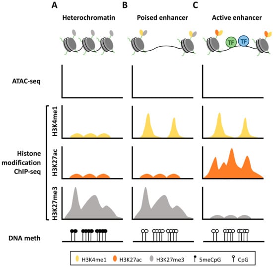 Chromatin landscape for heterochromatin, poised and active enhancer regions. (A) The inactive DNA is tightly packed around histone proteins marked with H3K27me3 modification, in the form of heterochromatin. This structure prevents any interactions of transcription factors (TF) with the DNA sequence. (B) When the enhancer region is pre-activated or poised, addition of H3K4me1 to the histone tails make the nucleosomes mobile, allowing their displacement to form highly accessible DNA regions, which get frequently demethylated. (C) Upon activation of enhancer region, nucleosomes flanking this region acquire H3K27ac, losing the repressing H3K27me3 mark, which subsequently recruits the corresponding transcription factors.