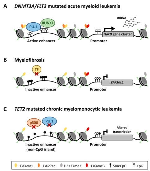 Enhancer DNA methylation is also relevant for other myeloid neoplasms such as chronic myelomonocytic leukemia (CMML). This rare clonal hematological disorder is characterized by the aberrant transformation of the hematopoietic stem cell compartment, displaying overlapping features of myelodysplastic syndromes (due to defective hematopoiesis), and myeloproliferative neoplasms (due to aberrant hyperactivated hematopoiesis) [81]. Pérez et al demonstrated that changes in DNA methylation in CMML patients seem to be associated with TET2 mutations [82]. TET2 is an epigenetic regulator that has been shown to catalyze the conversion of 5mC to 5-hydroxymethyl-cytosine (5hmC), leading to active DNA demethylation of the modified CpG sites. It plays important roles in normal hematopoiesis, including stem cell self-renewal, lineage commitment and terminal differentiation of monocytes [83,84,85]. TET2 has been recognized as a tumor-suppressor gene, which is frequently mutated in human hematopoietic malignancies. TET2 mutations can lead to frame-shift, new stop-codons, in-frame deletions, or highly conserved amino acid substitutions [85]. Such mutations have been demonstrated to impair TET2 catalytic activity, resulting in reduced 5hmC levels in affected cells. Interestingly, such aberrant DNA methylation profile detected in TET2-mutated CMML patient samples was significantly enriched outside CpG islands, which overlap with enhancer regulatory regions enriched for PU.1 transcription factor and p300 regulatory complex (Figure 2C), as was further validated in different studies [86,87,88]. However, these studies have also revealed a heterogeneous behavior of 5mC and 5hmC profiles in CMML patients, suggesting that epigenetic changes in this neoplasm are driven by additional mechanisms beyond the inactivation of TET2 protein.
