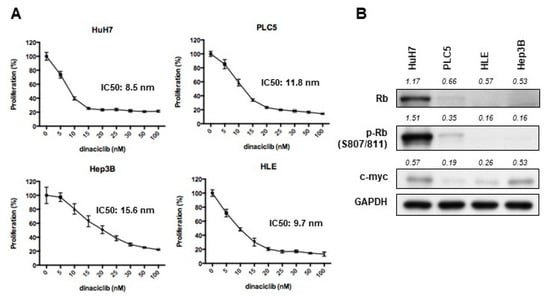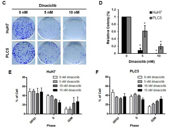 Cell proliferation was assessed using 3-(4,5-dimethylthiazol-2-yl)-2,5-diphenyltetrazolium bromide (MTT) assay or colony formation assay. For the former, the HCC cells were cultured overnight and treated with dinaciclib (Selleckchem, Houston, TX, USA) at indicated concentrations for 72 h. MTT was added to each well to obtain a final concentration of 0.4 mg/mL. The cells were subsequently incubated at 37 °C for 1.5 h. The reduced MTT dye was dissolved in DMSO, and the absorbance was measured at 540 nm. Cell proliferation was determined by calculating the relative changes in the absorbance. For the colony formation assay, HCC cells were seeded in 6-well plates with a cell density of 300–500 cells per well. The cells were incubated for 14 days. Subsequently, the cells were fixed with 100% methanol and stained with 0.23% crystal violet (Sigma–Aldrich, St. Louis, MO, USA). We then calculated the number of colonies formed.