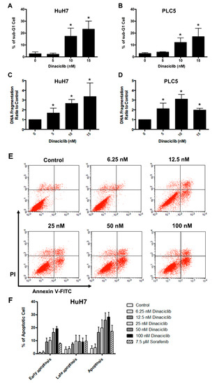(A,B) Cell cycle assay indicating the sub-G1 fractions of (A) HuH7 and (B) PLC5 cells after treatment with dinaciclib for 48 h. (C,D) Cell death detection ELISA indicating the amount of DNA fragmentation of (C) HuH7 and (D) PLC5 cells after treatment with dinaciclib for 72 h. (E,F) Flow cytometry results with HuH7 cells stained with annexin-V and PI after treatment with dinaciclib or sorafenib for 72 h. * denotes statistical significance compared to treatment with 0 nM dinaciclib.