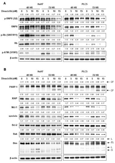 In both the HuH7 and PLC5 cells, dinaciclib inhibited the phosphorylation of Rb (target of CDK1 and 2), ataxia telangiectasia mutated kinase (ATM) (target of CDK5), and RNA polymerase II (target of CDK9) (Figure 3A).