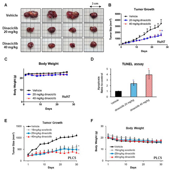 Xenograft studies. (A–D) Mice were subcutaneously injected with HuH7 cells. Treatment with vehicle (n = 6), dinaciclib 20 mg/Kg (n = 5), or dinaciclib 40 mg/kg (n = 6) was administered 3 times per week. Mice were sacrificed if the tumor size exceeded 1.5 cm in diameter or on the 29th day. (A) Representative photographs of tumors harvested from mice. (B) Tumor growth curve. * denotes statistical significance compared with treatment with the vehicle alone. (C) Body weight of mice. (D) TUNEL assay indicating apoptosis in the tumor sections. (E,F) Mice were subcutaneously injected with PLC5 cells. Treatment with vehicle (n = 3), dinaciclib 20 mg/Kg (n = 3), or dinaciclib 40 mg/kg (n = 3) was administered via intraperitoneal injection 3 times per week. Sorafenib (n = 3) was given orally for 5 days every week. (E) Tumor growth curve. * denotes statistical significance compared with treatment with the vehicle alone. (F) Body weight of mice.