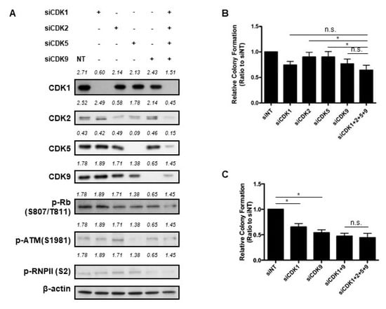 We used siRNA to inhibit the expression of various CDKs in the HuH7 cells (Figure 5A). Individual knockdowns of CDKs 5 and 9 decreased the level of their downstream molecules, phospho-ATM and phospho-RNA polymerase II, respectively. Individual knockdowns of CDKs 1 or 2 did not result in obvious decrease in phospho-RB levels. When the expression of CDKs 1 and 2 were simultaneously inhibited, phospho-Rb level decreased (Figure S1). Using the colony formation assay, we found that individual knockdowns of CDK1 and CDK9 inhibited colony formation, whereas individual knockdowns of CDK2 and CDK5 did not. Furthermore, simultaneous knockdowns of CDKs 1, 2, 5, and 9 yielded significantly less colony formation than did individual knockdowns of CDK2 and CDK5 (Figure 5B). Although simultaneous knockdowns of CDKs 1, 2, 5, and 9 resulted in less colony formation than did individual knockdowns of CDK1 and CDK9, the difference did not reach statistical significance (Figure 5B). Composite knockdowns of CDKs 1 and 9 and composite knockdowns of CDKs 1, 2, 5, and 9 resulted in similarly reduced colony formation (Figure 5C).