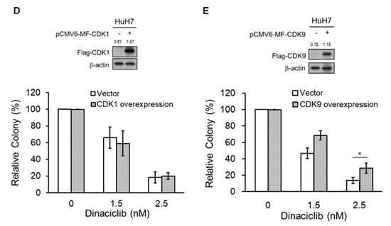 (A) Western blot analysis results indicating the expression of various CDKs and their downstream molecules after transfection with siRNAs for 72 h. Nontarget (NT) siRNA served as a negative control. (B,C) Colony formation assay. After transfection with the indicated siRNAs for 24 h, the cells were seeded and incubated for 14 days. Data are presented as the colony number relative to that of HuH7 cells treated with NT siRNA. * denotes statistical significance of the comparisons between the two manipulations (n.s. = not significant). (D,E) Colony formation assays. Cells were transfected with the vector overexpressing CDK1 (D) or CDK9 (E) and then incubated with dinaciclib at the indicated concentration. * denotes statistical significance of the comparisons between the two manipulations.