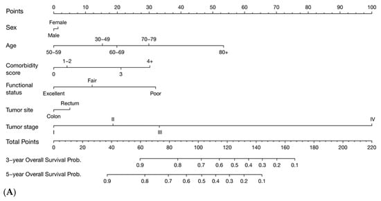 Given the strong dependency of CRC patients’ prognosis on stage at diagnosis, the TNM (tumor–node–metastasis) staging system is central for prognostication of CRC [,]. However, it exclusively takes tumor spread into account. Several nomograms were, therefore, proposed in the past decade to enhance prediction of CRC prognosis [,,,,,,,,,,]. These nomograms included additional relevant variables and demonstrated higher predictive capacities than tumor stage, but mostly focused on tumor characteristics. In the era of personalized oncology, patients’ factors such as comorbidities and functional status often receive less attention as prognostic factors but could be equally important as tumor characteristics. Few nomograms incorporated functional status [,,,], but were derived from data on patients enrolled in randomized controlled trials (RCTs) who are often younger, have fewer comorbidities, and have higher functional status than unselected patient populations. In addition, these nomograms were designed for specific patient groups (e.g., stage III [] and IV []) or for short-term outcomes only (six-month mortality) []. A recent, large population-based study from England [] incorporated some specific comorbidities but did not consider functional status.